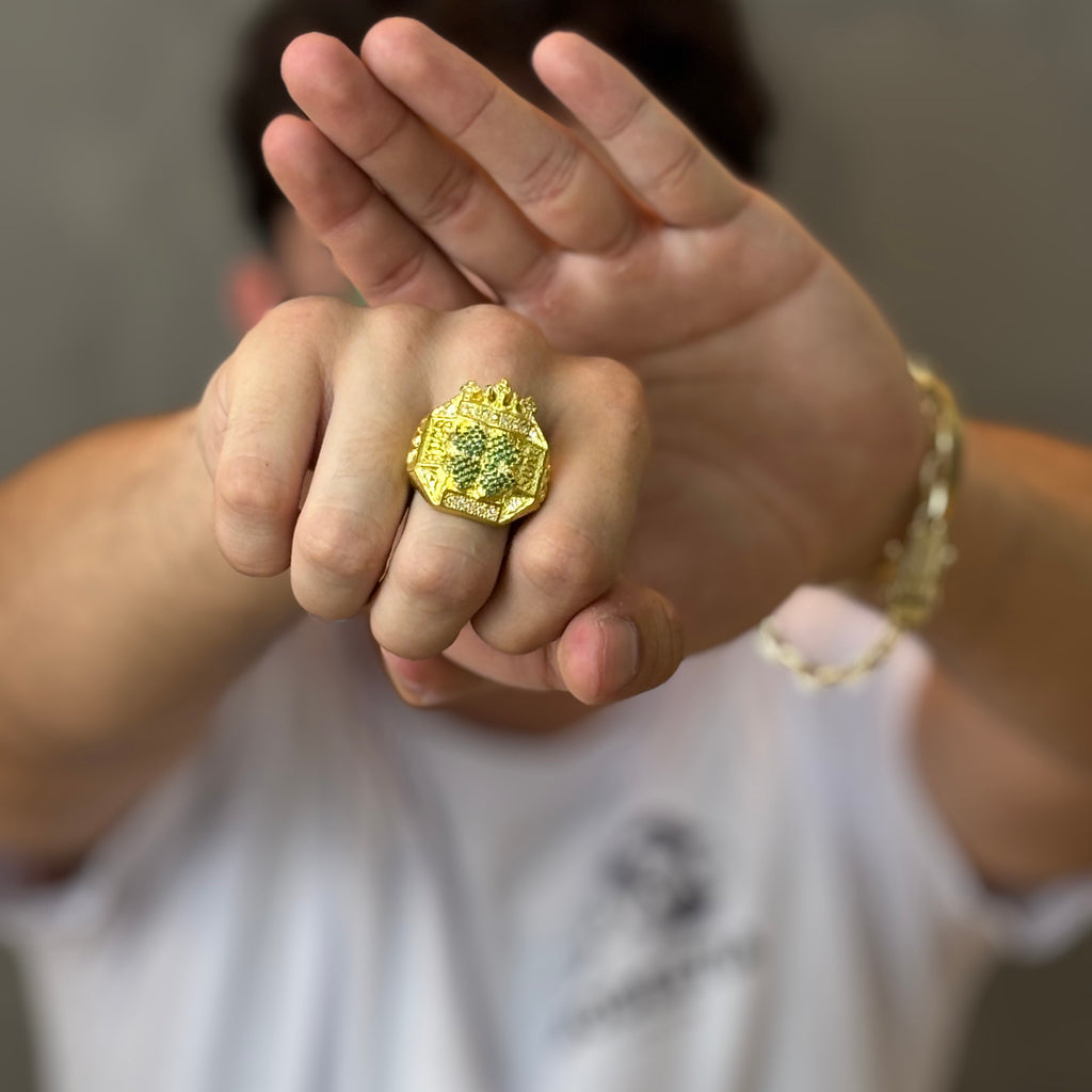 É mais do que um anel, é um símbolo de sorte e exclusividade. Feita a partir de moeda antiga autêntica, carrega uma história rica em cada detalhe. O design quadrado imponente, com cravação luxuosa de pedras verdes formando um trevo, traz um toque de sofisticação e significado. O brilho intenso das pedras claras ao redor adiciona ainda mais destaque à peça, tornando-a um verdadeiro amuleto para quem valoriza estilo e personalidade.