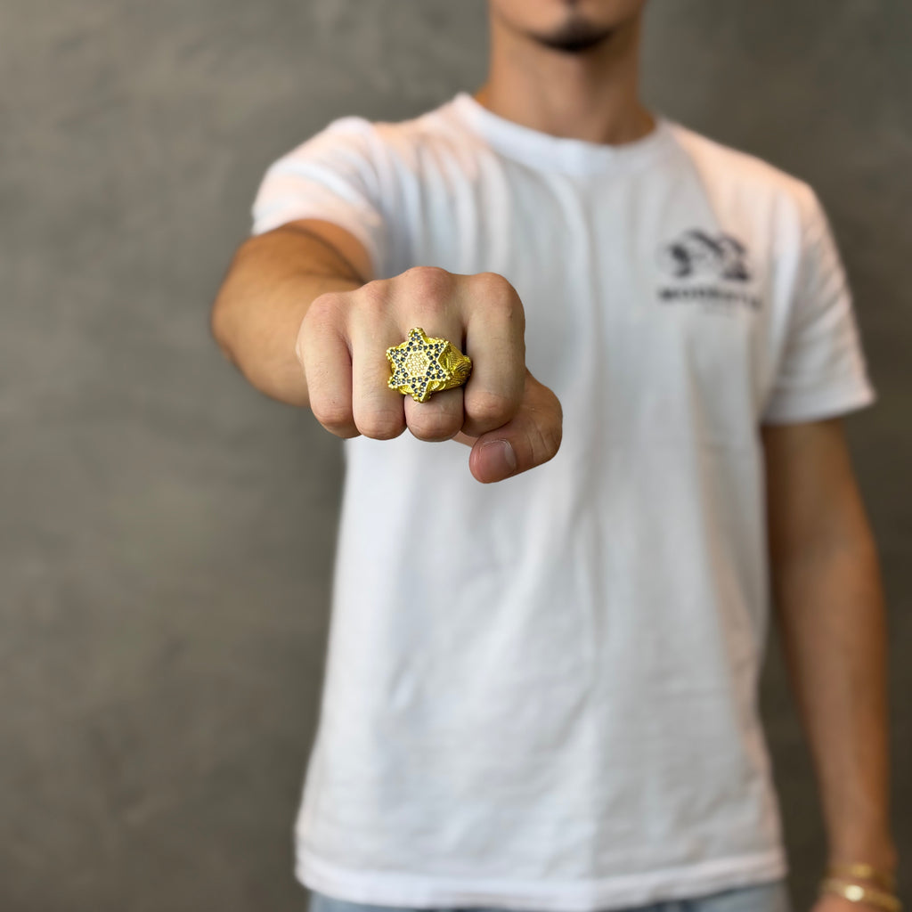 Seu design imponente traz a Estrela de Davi em destaque, cravejada com pedras pretas e brancas, criando um contraste sofisticado e marcante. Uma peça ideal para quem busca estilo, história e exclusividade em um único acessório.