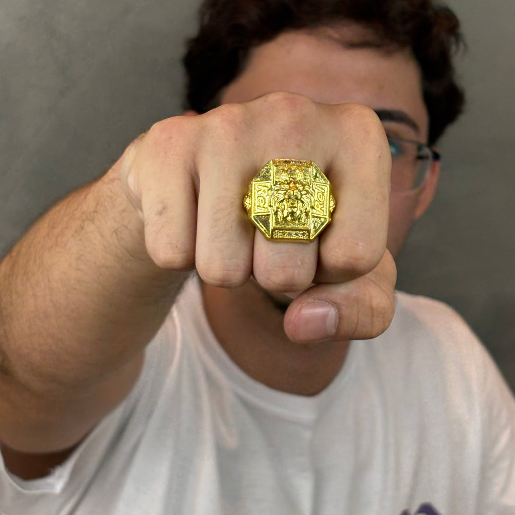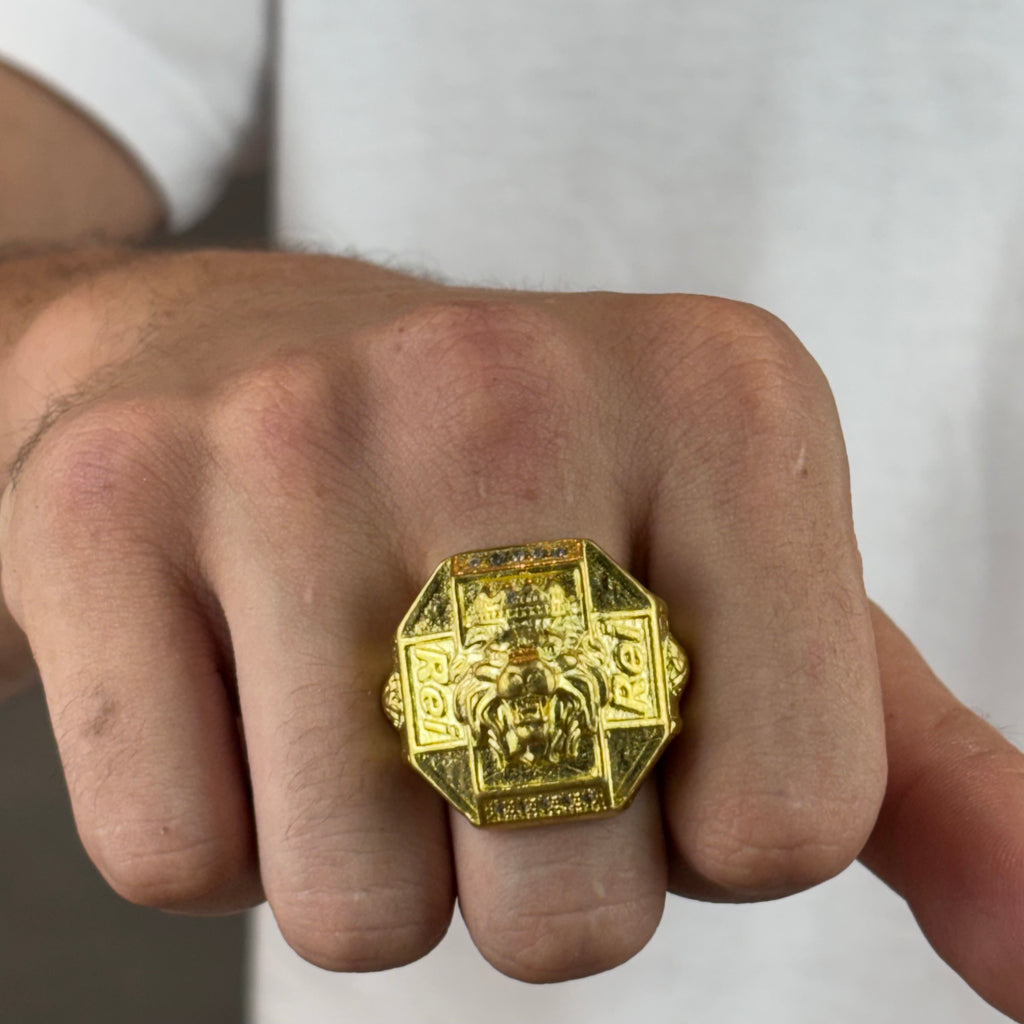 Realeza não se pede, se impõe. Com um leão em alto-relevo, cravejado de pedras e a palavra “Rei” gravada com firmeza, esse anel é feito pra quem nasceu pra dominar. O formato octogonal e os detalhes imponentes transformam a peça numa joia de liderança e respeito – onde você chegar, vão saber quem manda.